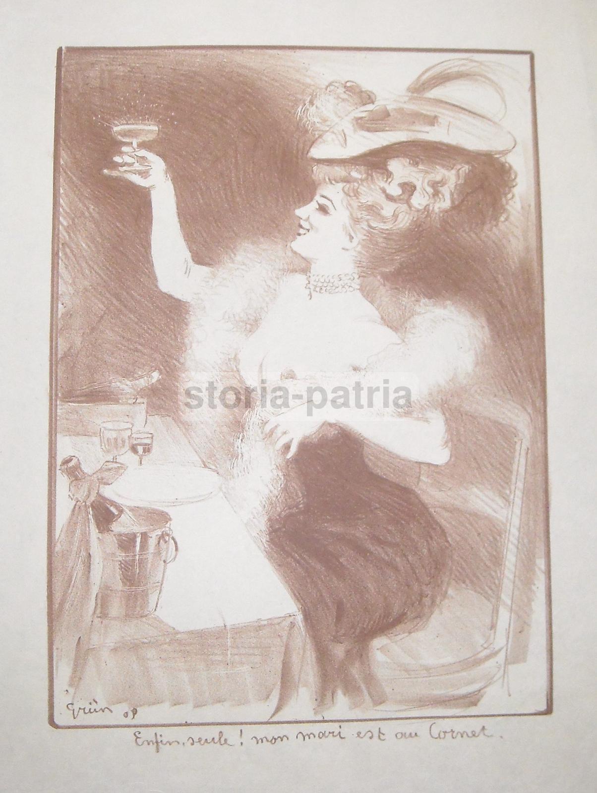 Arte, Bella Antica Lito, Grun, Sensuale Immagine Femminile, Liberty, Decorativa, Rara